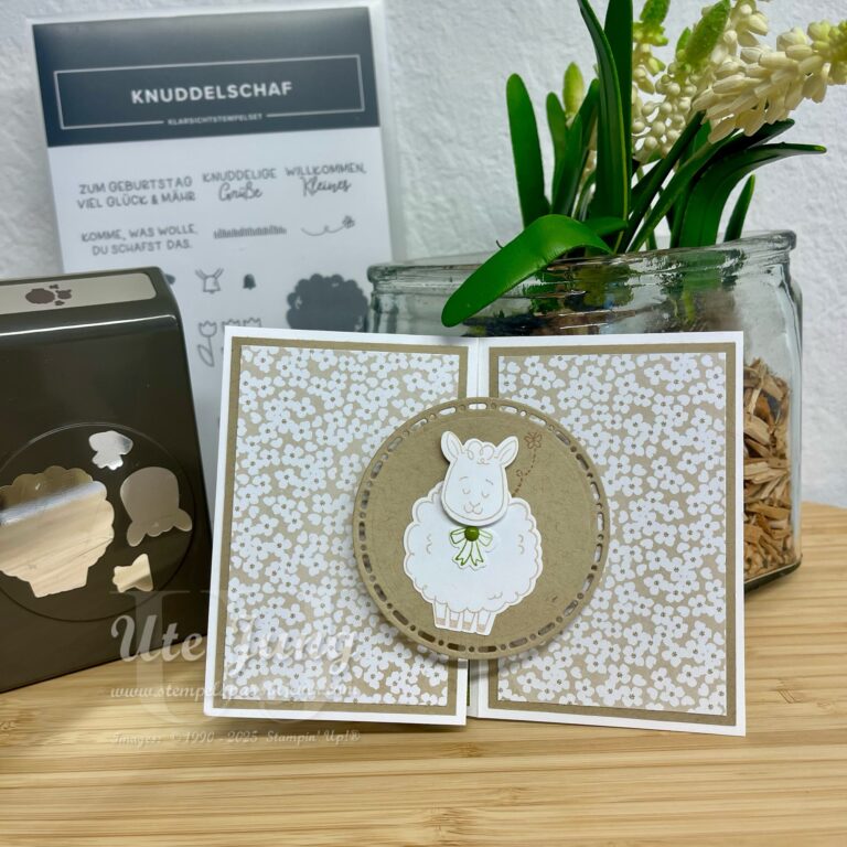 Knuddelschaf ist bei dieser Karte definitiv Programm! Ich habe eine besondere Pop-Up-Karte mit dem Produktpaket Knuddelschaf gebastelt. Das Set besteht aus einem Stempelset und einer passenden Handstanze und macht einfach Spaß beim Kreativsein. Zieht man die Karte auf, poppt das „Schaf“ quasi in die Höhe – ein schöner Überraschungseffekt, der sofort ins Auge fällt. Trotz…