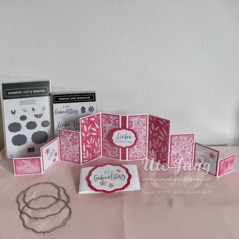 Beim letzten Kreativtag habe ich diese große Stufen-Klappkarte mit den Teilnehmerinnen gebastelt. Diese Karte ist nicht nur ein echter Hingucker, sondern auch vielseitig einsetzbar – perfekt für persönliche Grüße und besondere Anlässe. Gebastelt ist sie mit Produkten von Stampin‘ Up! Details zur Stufen-Klappkarte Verwendet habe ich das Designerpapier aus der In Color 2025–2027 Kollektion. Meine Teilnehmerinnen…